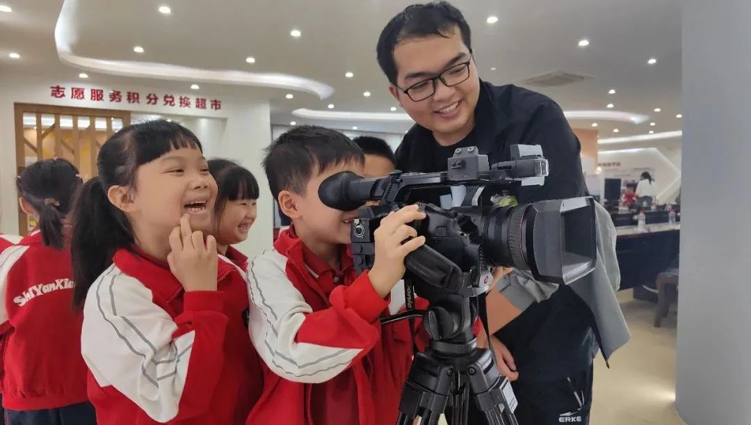 “什么是记者?”“记者采访的时候要用到哪些工具?”家长志愿者及记者老师们通过图片展示、播放视频片段、实物教学等方式,讲解新闻拍摄技巧、操作演示摄像机具体使用方法等,并分享采访经历,让孩子们对记者工作有了具体认识。