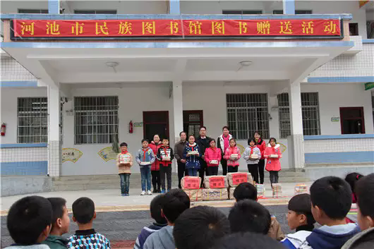 2016年12月15日,河池市民族图书馆到金城江区三旺中心小学开展图书赠送活动,活动现场,我馆吴新波、韦雅淳两位主任亲手给该校学生们送上我馆精心挑选的少儿图书,有《小学生优秀作文》、《脑筋急转弯》、《故事大全》等400多册适合小学生阅读的精美图书。