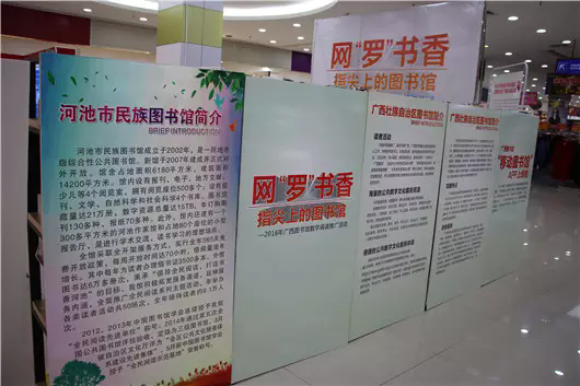 2016年11月19—20日,数字阅读推广活动“网‘罗’书香•指尖上的图书馆”在河池市大洋购物广场成功举办。活动由广西图书馆主办,河池市图书馆、南宁市百文图书有限责任公司协办。图书馆的相关负责同志和员工、高校志愿者、社会公众3000多人参加了活动。