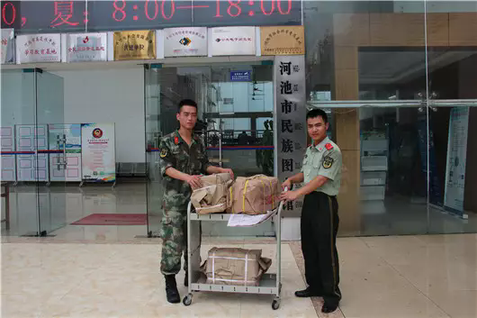 在“七一”党的生日来临之际,为丰富部队官兵的业余文化生活,2016年6月12日。我馆精心挑选了适合部队官兵阅读的,内容涵盖文学、励志、军事、法律、历史、科技等方面的图书1000余册,赠送给武警河池市支队,为官兵们紧张执勤、训练之余送去了丰富的“精神食粮”,并向他们致以节日的祝福。送去的这批图书,深受战士们的欢迎。