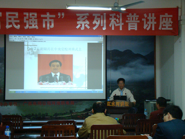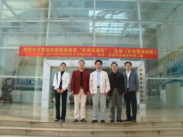 2011年10月29日,河池市委党校副教授覃劲忠同志应邀到“红水河讲坛”作社会管理创新专题讲座。随着市场经济发展和社会变革不断深化,我国正处在体制改革的攻坚期和社会矛盾的凸显期。为适应形势发展需要,市社科联、市民族图书馆在“红水河讲坛”安排了社会管理与创新专题,并邀请市委党校副教授覃劲忠同志主讲。覃劲忠副教授以通俗的语言、丰富的案例、从多角度对社会管理与创新以及社团组织如何参与社会管理作深入的分析和讲解,驻金各社团组织(机构)负责人、各社团主管部门有关人员等听众聆听讲座。