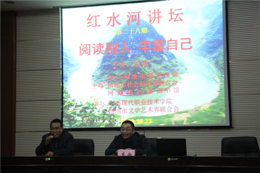 12月23日,“红水河讲坛”成功举办第二十八期讲座活动。本次活动由市委宣传部、市社会科学界联合会、市民族图书馆联合主办,广西现代职业技术学院、河池市文学艺术联合会承办。活动在广西现代职业技术学院举行,吸引了河池各界文化学者,学校老师,高校学生等300多人前来聆听,文广局领导、我馆馆长谭荣玲及吴新波主任出席了本次活动。