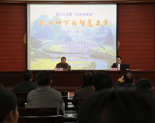 本期“红水河讲坛”以“孔子种下的智慧果实”为主题,荣幸地邀请到河池市委宣传部副部长杨合讲课。杨部长围绕“孔子的智慧”,重点诠释了孔子“与人相处”的学说观点:“与人相处,重在仁与德,己所不欲勿施于人”,人应该在各方面提升自己的情操,学会与人相处,拥有良好的人际关系,方能身心愉悦。
