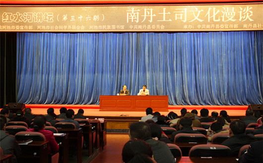 本期“红水河讲坛”以“南丹土司文化漫谈”为主题,荣幸地邀请到南丹县政协常务主席慕仕凡讲课,慕主席是一位多才多艺的作家,中国作家协会广西分会会员、广西民间文艺家协会会员。先后在《民族文学》、《广西文学》、《百越民风》、《南丹文学》、《广西日报》、《河池日报》、《北海日报》等杂志报纸上发表中、短篇小说十多篇,收集整理出版白衬裤瑶叙事长诗和民间故事二十多篇(首)。参加和组织修编第一、二部《南丹县志》。慕主席就南丹土司文化的起源,南丹土司文化的历史,南丹土司文化的特点栩栩如生的向我们展示了一个深具历史文化色彩的南丹,并在最后就如何利用南丹的土司文化打造南丹、发展南丹提出自己的鲜明观点。