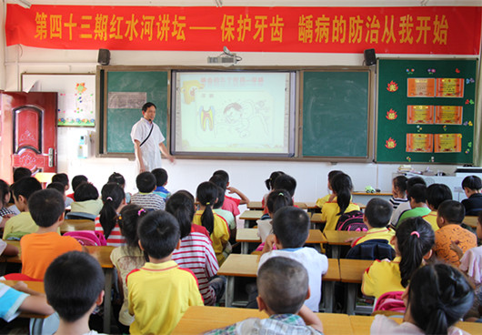9月16日下午,一堂别开生面的健康知识讲座在金城江第二小学举行,二年级二、三班的学生们聚精会神,津津有味地聆听口腔专家给他们讲授口腔卫生知识。本次活动为“红水河讲坛”第四十三期讲座,由市委宣传部、市社会科学界联合会、市民族图书馆联合主办。