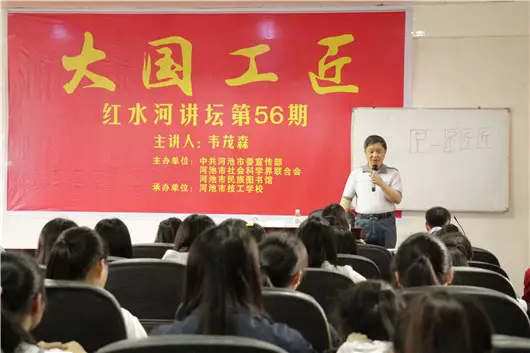 红水河讲坛是由市委宣传部、市民族图书馆和市社科联共同主办的人文社科文化品牌讲坛,自2011年创办以来已成功举办了55期。4月17日下午,我们邀请到全国著名教育专家韦茂森老师为河池市技工学校200多名学生作《大国工匠》专题讲座,韦老师引经据典,从2015年以来每年央视“五一”专题节目《大国工匠》讲述到“8双劳动的手”所缔造的神话,他们数十年如一日地追求着职业技能的极致化,靠着传承和钻研,凭着专注和坚守,缔造了一个又一个的“中国制造”。接着讲到我们技校的同学如何把书本的知识转化为能力,追求职业技能的完美和极致,拓展人生价值等,讲座深受同学们的欢迎。