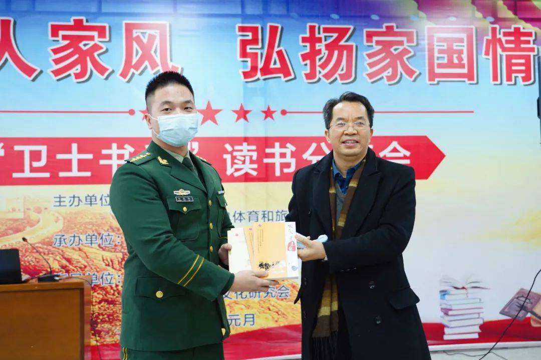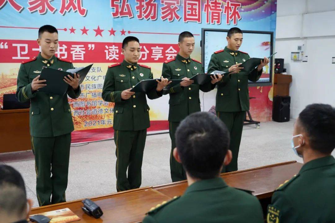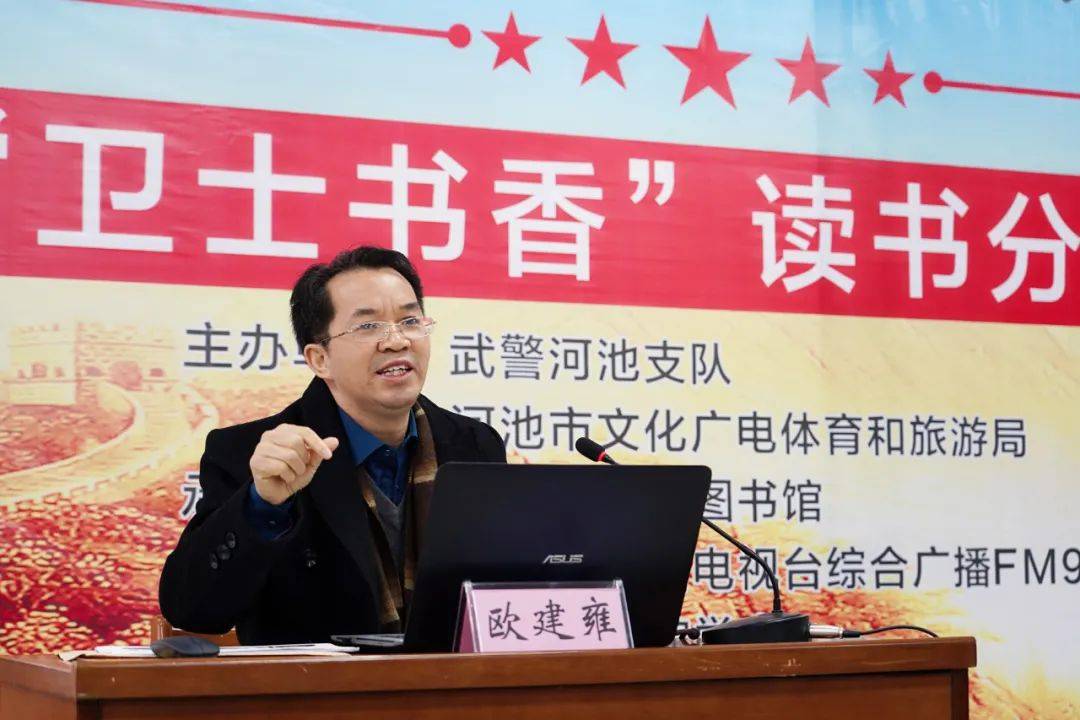 今天上午,由武警河池支队、河池市文化广电体育和旅游局主办,河池市民族图书馆、河池广播电视台综合广播FM98.7 承办的“传承军人家风弘扬家国情怀”主题宣讲活动举行,旨在一起分享读书的意义和乐趣,心怀志向共建军民鱼水情,携手共赴强国伟业。广西社科联常委、广西社科联社会组织党委委员欧建雍,市文广体旅局副调研员覃启朗,武警河池支队副政治委员周柱铿,市民族图书馆馆长谭荣玲参加活动。