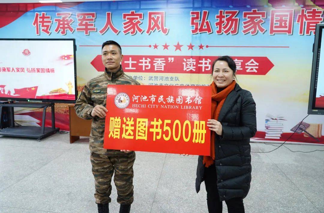 活动现场还举行了“图书赠送仪式”,图书馆工作人员根据官兵们的阅读需要,精心挑选了思想政治、人文历史、名人传记、实用技术等500 余册图书赠送给武警支队。
