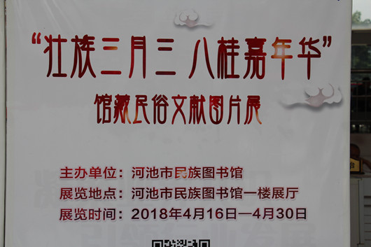 在2018年“三月三”期间,我馆在自治区图书馆的大力支持下,以民族节日为契机,在本馆一楼大厅内举办“壮族三月三 八桂嘉年华”民俗风情图文展,图文展出壮族的史、祭、字、圩、歌、鼓、舞、锦、食这些内容,通过图文并茂的形式向广大读者介绍广西壮族民俗文化的丰富内涵,并从中感受壮族文化的无限魅力。图文的展出引来众多到馆读者的观看。