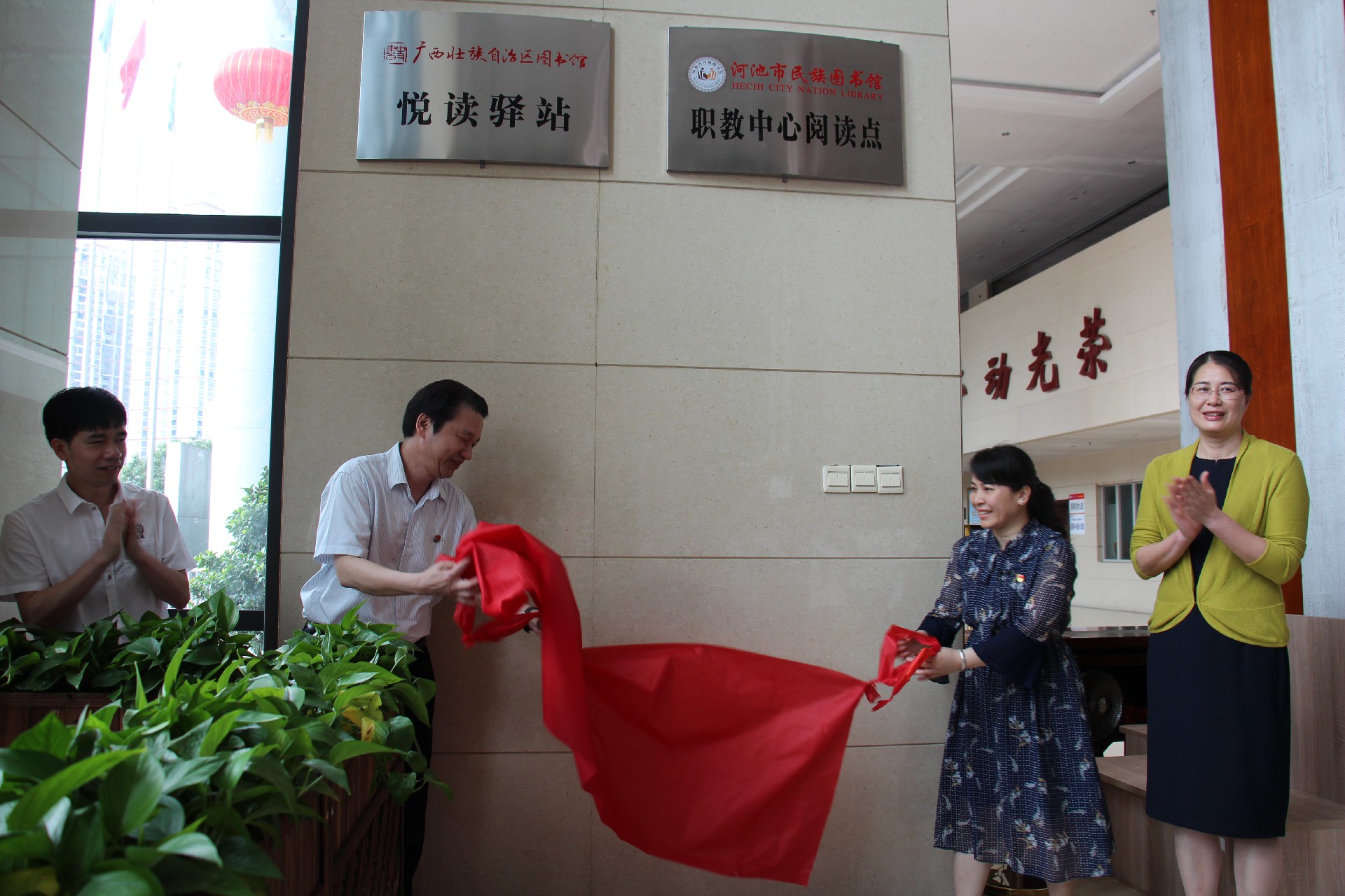 在现场师生和工作人员的注目与期待中,黄绍光校长、谭荣玲馆长及有关领导对阅读点进行揭牌,市职教中心校园阅读点正式落成。