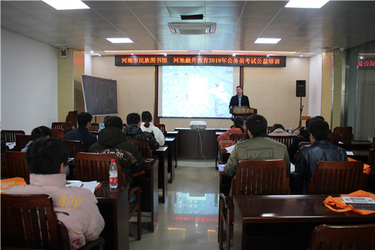 2019年广西公务员考试已进入备考阶段,为让考生更高效的备考,不断提升自己的申论写作水平,我馆联合河池市融升教育于2019年3月2日在本馆二楼多功能室举办公务员考试申论高分技巧公益培训活动。