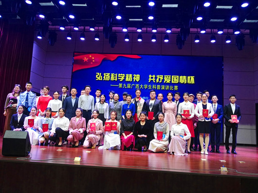 11月24日,第九届广西大学生“弘扬科学精神 共抒爱国情怀”科普演讲比赛在自治区图书馆举行。此次比赛由自治区图书馆、共青团广西区委学校部、广西科学技术协会科普部联合主办,旨在深入贯彻习近平新时代中国特色社会主义思想和党的十九大精神,推动“创新、绿色、开放、共享”的发展理念深入人心,激发高校学生爱国奉献热情,积极投身科技创新实践,在全社会营造学科学、爱科学、用科学的浓厚氛围,促进全民科学素质跨越提升。