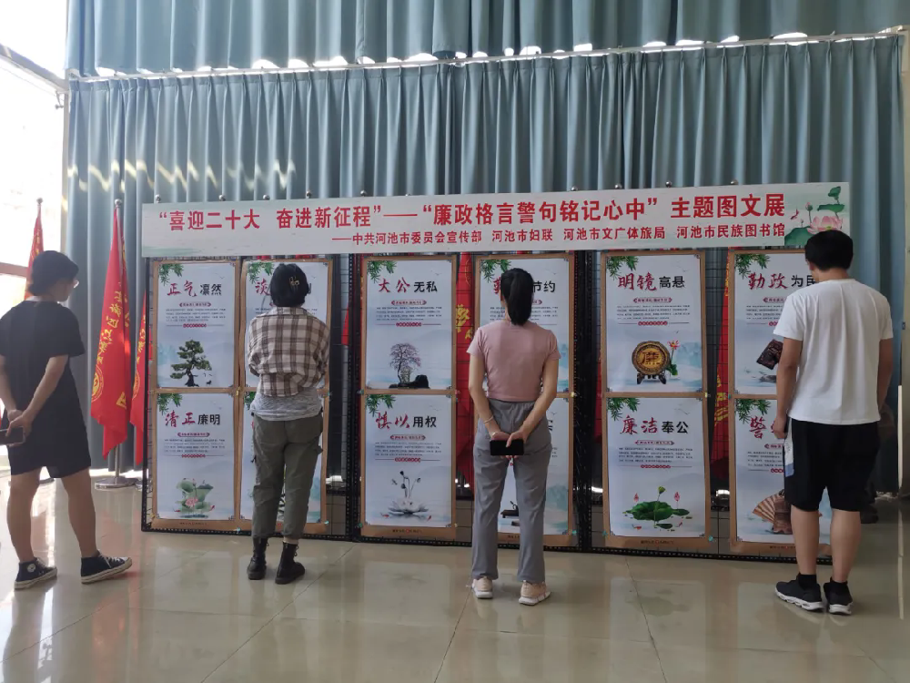 为深入贯彻落实习近平总书记视察广西“4.27”重要讲话精神和对广西工作系列重要指示要求,大力弘扬廉政文化,积极探索新形势下廉政文化宣传教育新途径,9月6日起,河池市民族图书馆举行“廉政格言警句铭记心中”主题文化图文展。该展览将持续两个月,以线上线下形式同步开展,线下展设在图书馆一楼大厅,线上展将通过微信公众号及馆网站“网上展览”栏目同步推出。
