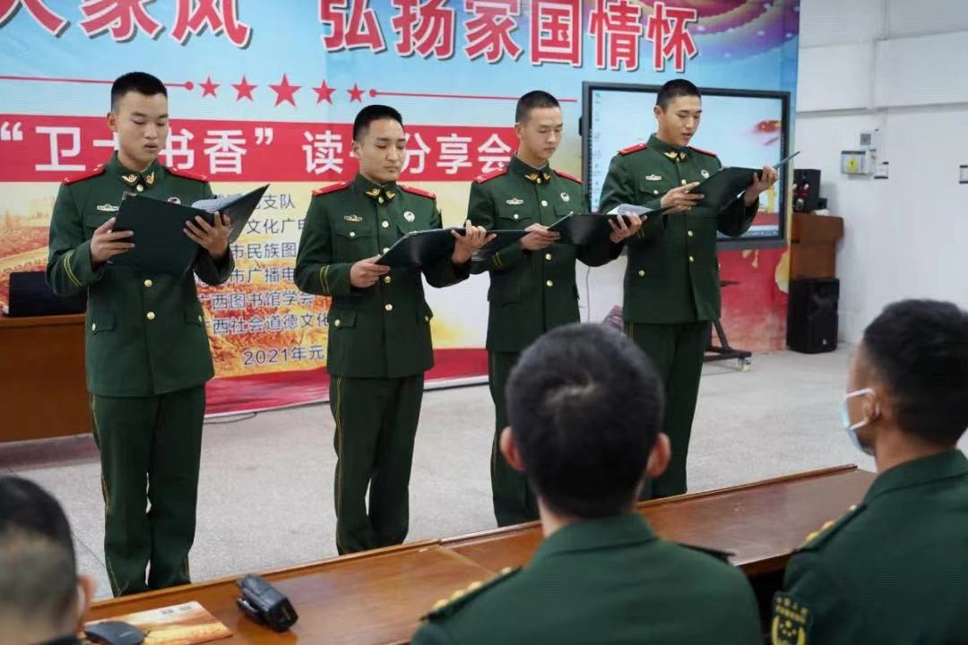此次活动由武警河池支队与河池市文化广电体育和旅游局联合主办,河池市民族图书馆、河池广播电视台综合广播FM98.7共同承办。亲临活动现场的领导有广西社科联常委、广西社科联社会组织党委委员欧建雍,市文广体旅局副调研员覃启朗,武警河池支队副政治委员周柱铿,市图书馆馆长谭荣玲。来自机动中队、河池中队、勤务保障大队的180名官兵参加了本次活动。